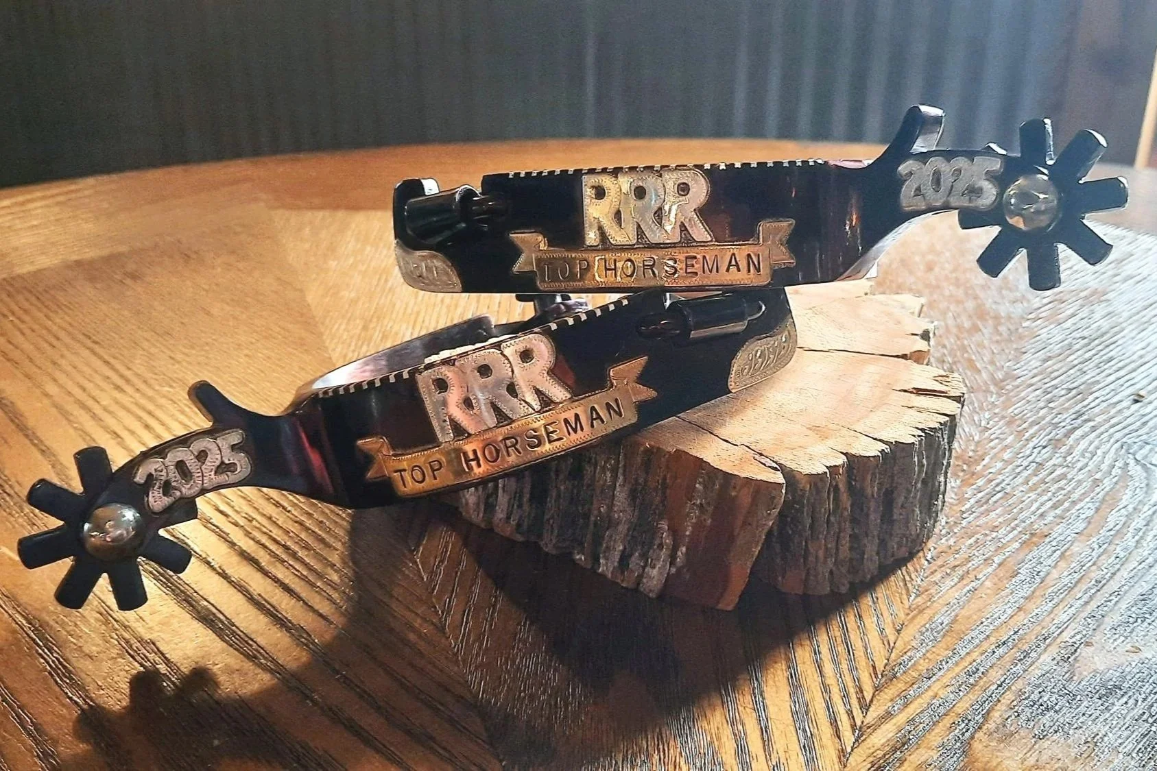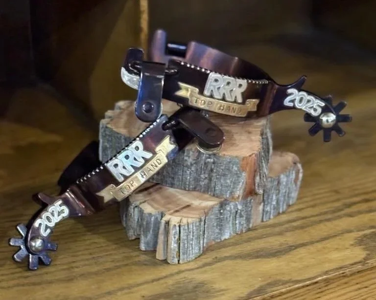 An additional award will be presented to a contestant selected as Top Horseman. Spurs crafted by Gary Johnson. Donated by The Wade Family.